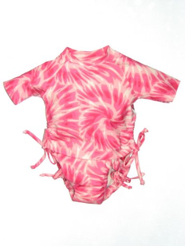 UPF 50+! Stretchy rashguard has brief sleeves and shirred ties on sides. Bottom has matching ties. Nylon/Lycra with polyester lining and a built-in Ultimate Swim Diaper..